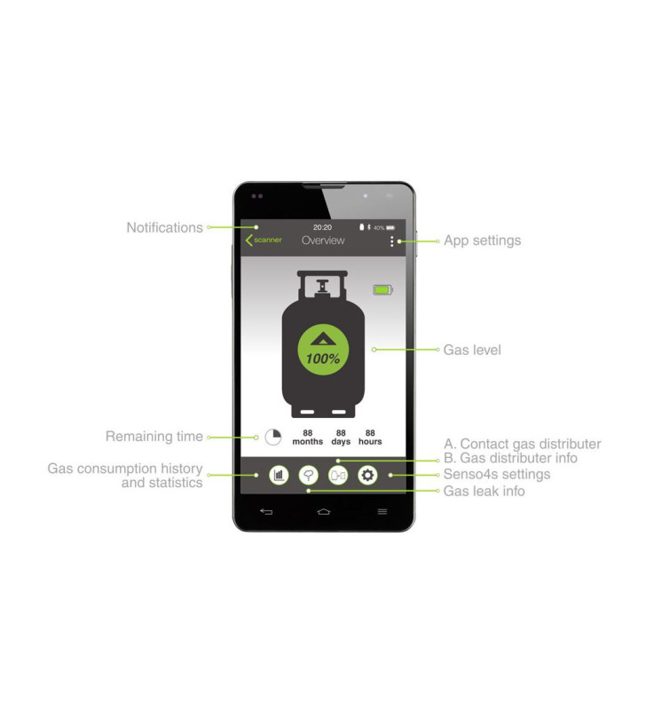 Senso4s consente una supervisione del consumo di gas o dei livelli di gas nelle bombole di gas e in caso di fughe di gas, anche rilevamento e notifica.