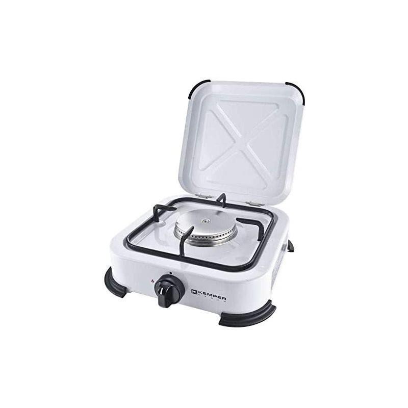 Herd mit 1 Brenner aus Edelstahl. Stabil und robust mit abnehmbarem Deckel und Grillrost für optimale Reinigung. Leistung 1,2 kW. Ideal für Camping und Kochen im Freien. Fest montierter Brenner für praktischen Transport auch beim Camping. Rutschfeste Füße, Struktur aus mit Epoxidpulver beschichtetem Stahl.
