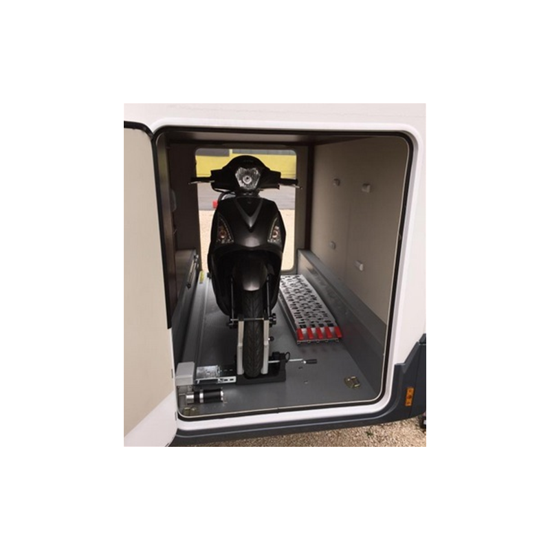 Der elektrische Motorradträger Pollicino wurde für Camper entwickelt, die ihre Roller und Motorräder transportieren möchten, ohne sich um das Ein- und Ausladen in der Garage kümmern zu müssen. Dank seines Elektroantriebs kann der Pollicino Fahrräder, Roller und Motorräder mit einem Gewicht von bis zu 150 kg mühelos transportieren.