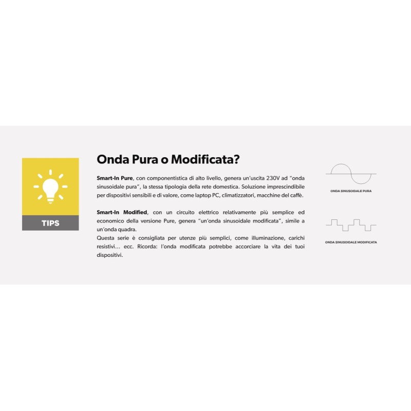 Die SMART-IN-Familie wird häufig als Wechselrichter für Camper, als Wechselrichter für Autos eingesetzt und besteht aus zwei Linien: Modified und Pure, die sich durch den Typ der Ausgangswelle unterscheiden. Die beiden Produktlinien decken verschiedene Leistungsbereiche von 400W bis 3000W ab, mit der Möglichkeit (bei einigen Modellen), eine Eingangsspannung von 24V zu haben.