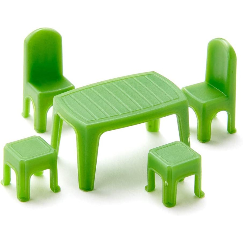 Mit Tisch, Stühlen und Hockern