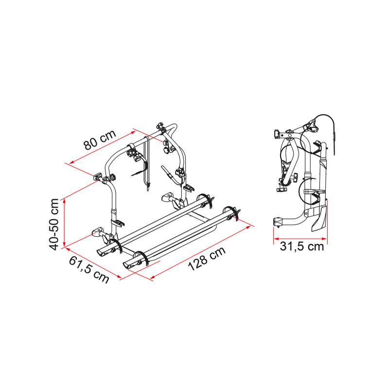 Portabicicletas Pro C en una versión especial con distancia entre ejes de 80 cm, diseñado para campistas Laika.
