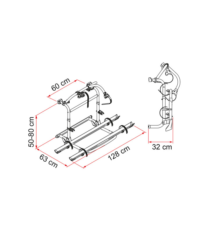 CAPACIDAD: Transporta dos bicicletas de serie, con el agregado de 2 canales Rail Quick y los correspondientes Bike-Blocks opcionales transporta hasta 4 bicicletas. Carga máxima 60 kg.