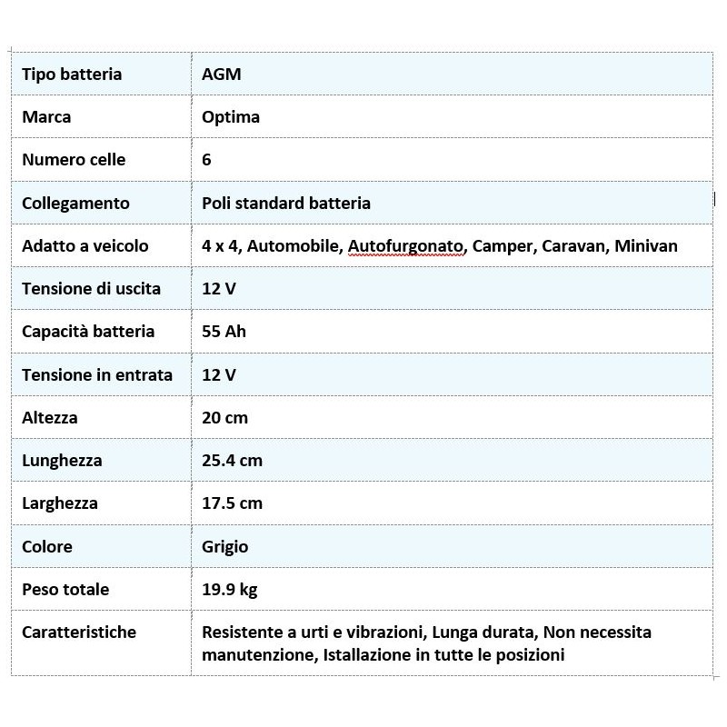 The Optima YTS 55 Ah battery has a capacity of 55 ampère/hour and allows you to maneuver a caravan weighing up to 2100 kg for 15 minutes.