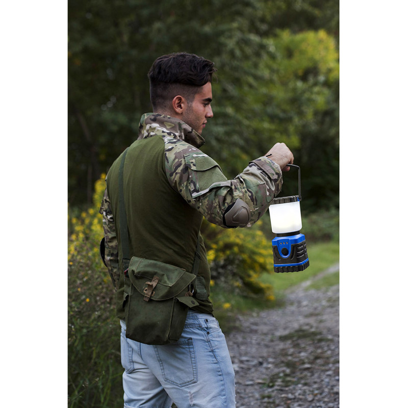 Battery-powered Led camping lamp (3xD) with handle and hook at the base.