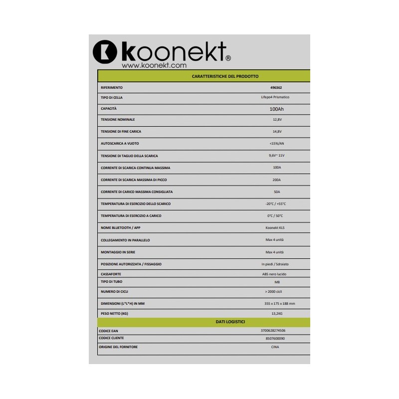 Godetevi una batteria progettata per durare. Con una durata di oltre 2000 cicli, la batteria compatta Koonekt vi garantisce molti anni di utilizzo senza problemi. A differenza delle batterie al piombo, presenta un'autoscarica molto bassa (<15% all'anno), che consente di conservare l'energia per lunghi periodi di inutilizzo. Con una capacità di ricarica rapida e una soglia di scarica sicura tra 9,6 V e 11 V, questa batteria è in grado di alimentare una vasta gamma di dispositivi, che si tratti di veicoli elettrici, attrezzature da campeggio o impianti solari.