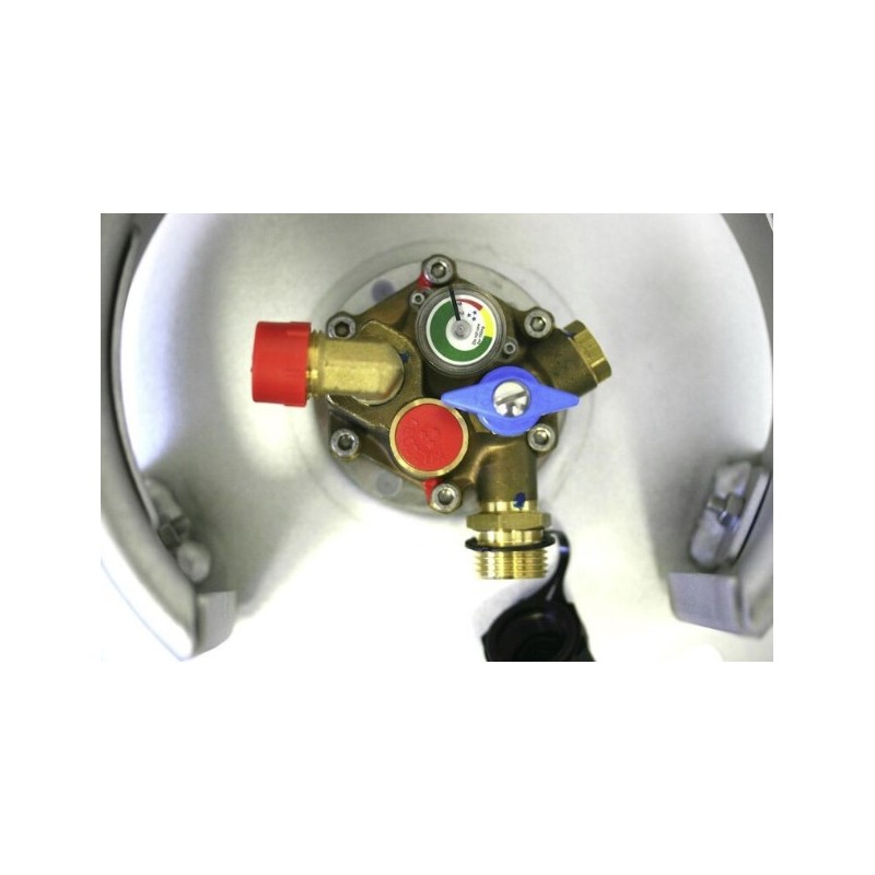 La bombola di rifornimento Alugas TravelMate viene fornita preassemblata con una cosiddetta multivalvola. Oltre a tutte le necessarie caratteristiche di sicurezza, la valvola offre anche il cosiddetto arresto di riempimento all'80%, che rende possibile il rifornimento a qualsiasi livello di riempimento. Inoltre, l'indicatore del livello di riempimento collegato alla valvola fornisce informazioni sull'attuale livello di riempimento della bottiglia.