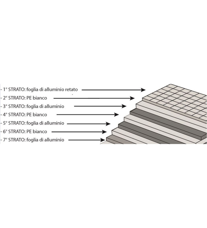 Materiale 7 strati trapuntati costituiti da 4 strati di alluminio alternati con 3 strati di PE bianco