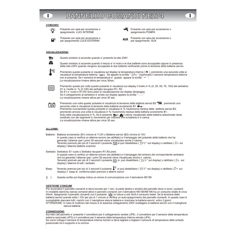 Indicatore voltaggio batteria servizi e motore, comando luci e pompa, temperatura IN e OUT, serbatoio S1 4/4, serbatoi R1 e R2 FULL.