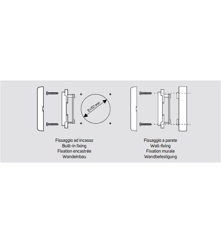 Da incasso o da parete con distanziale in dotazione; completo di cornice Becker “BMAC1C”, abbinabile alla serie "Modular Plates" e "Modular Plates Becker".