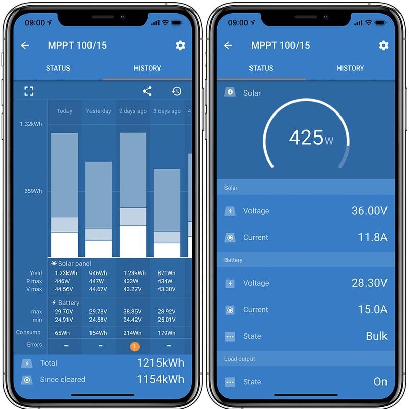 Controllate e monitorate le funzioni complete del vostro caricabatterie SmartSolar MPPT con Bluetooth integrato a distanza, accoppiandolo con il vostro smartphone o altro dispositivo tramite VictronConnect. Se la vostra installazione è connessa a Internet, potete accedere a tutta la potenza del vostro MPPT in qualsiasi momento e in qualsiasi luogo tramite il Victron Remote Management Portal (VRM); entrambi i servizi sono gratuiti. Per le installazioni remote, anche se non c'è una connessione a Internet o un segnale telefonico nelle vicinanze, è possibile monitorare l'MPPT tramite l'accoppiamento Bluetooth con un dispositivo LoRaWAN (long-range wide area network), disponibile come opzione.