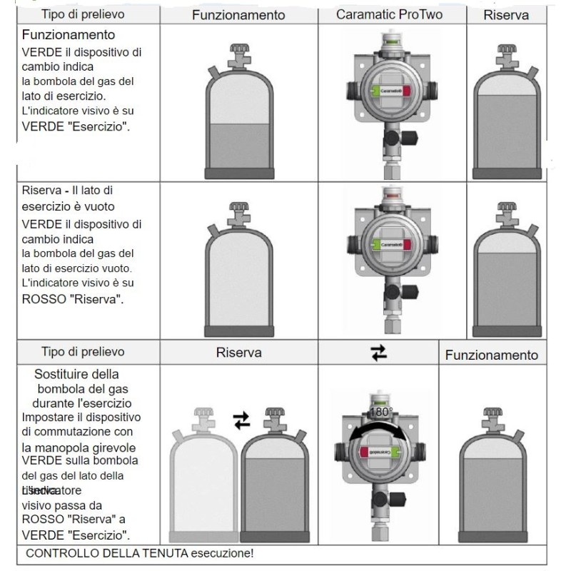 Questo regolatore di pressione può essere collegato a due bombole del gas e passa automaticamente dalla bombola in uso a quella di riserva non appena la prima è vuota.