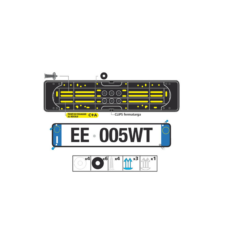 Kit completo composto da: Portatarga, 4 rondelle in metallo, 6 distanziali in polipropilene, 4 viti autofilettanti, 3 bottoni di fissaggio azzurri, 1 bottone di fissaggio bianco2